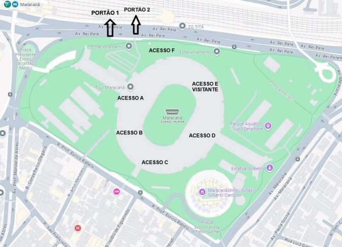 ATENÇÃO: após comprar seu ingresso, não será necessário retirar o bilhete físico, uma vez que o acesso ao Maracanã acontece exclusivamente por meio da biometria facial. Neste sábado, a torcida do Inter ocupará o Setor Norte Superior 2 do estádio, cuja entrada ocorre através do Acesso E, localizado na Rua Mata Machado com Avenida Maracanã, em frente ao Museu do Índio. Veja o mapa abaixo: